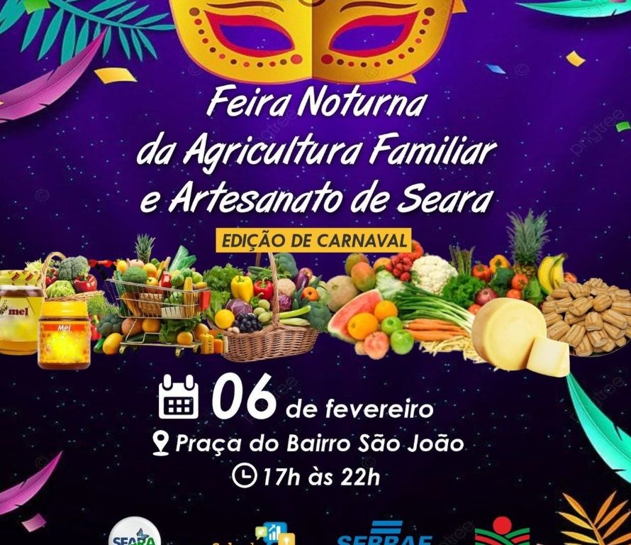 A 13ª edição da Feira Noturna da Agricultura Familiar e Artesanato de Seara acontece nesta sexta-feira, 6 de fevereiro, das 17h às 22h, na Praça do Bairro Industrial, e promete uma programação especial em clima de Carnaval, reunindo cores, sabores, cultura e lazer para toda a comunidade.