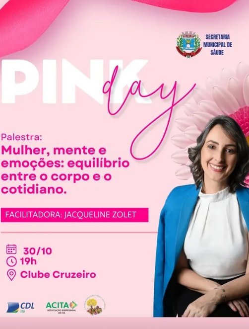 O Pink Day será realizado nesta quinta-feira (30/10), às 19h, no Clube Cruzeiro, em Itá, com a palestra “Mulher, mente e emoções: equilíbrio entre corpo e o cotidiano”, ministrada pela facilitadora Jacqueline Zolet.