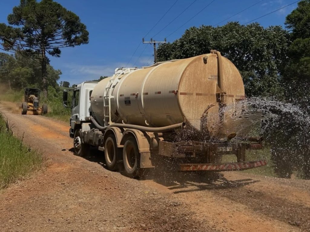 Em razão do período de estiagem, os serviços de patrolamento estão sendo realizados com o apoio de um caminhão-pipa, que faz a umidificação da estrada. A medida é necessária para melhorar a compactação do solo, reduzir a poeira e assegurar maior qualidade e durabilidade do serviço executado.