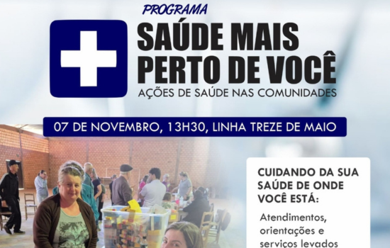 O Programa “Saúde Mais Perto de Você” acontece nesta sexta-feira, 7 de novembro, em Seara, no Centro Comunitário da Linha Treze de Maio, a partir das 13h30. A edição oferece atendimentos médicos, orientações de enfermagem, entrega de medicamentos, avaliações de saúde e uma palestra voltada à prevenção e aos cuidados, com foco em facilitar o acesso a serviços básicos para moradores da região.